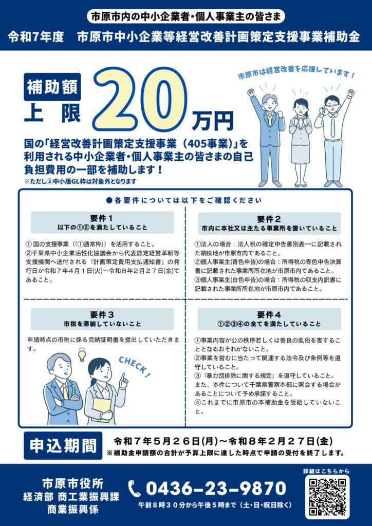 市原市では、中小企業者の経営改善や事業再生の促進を図るため、国の支援事業「経営改善計画策定支援事業(405事業)」の「①通常枠」の活用を条件として、事業者の自己負担となる費用の一部に対して補助金を交付し、「経営改善計画策定」を支援しております。